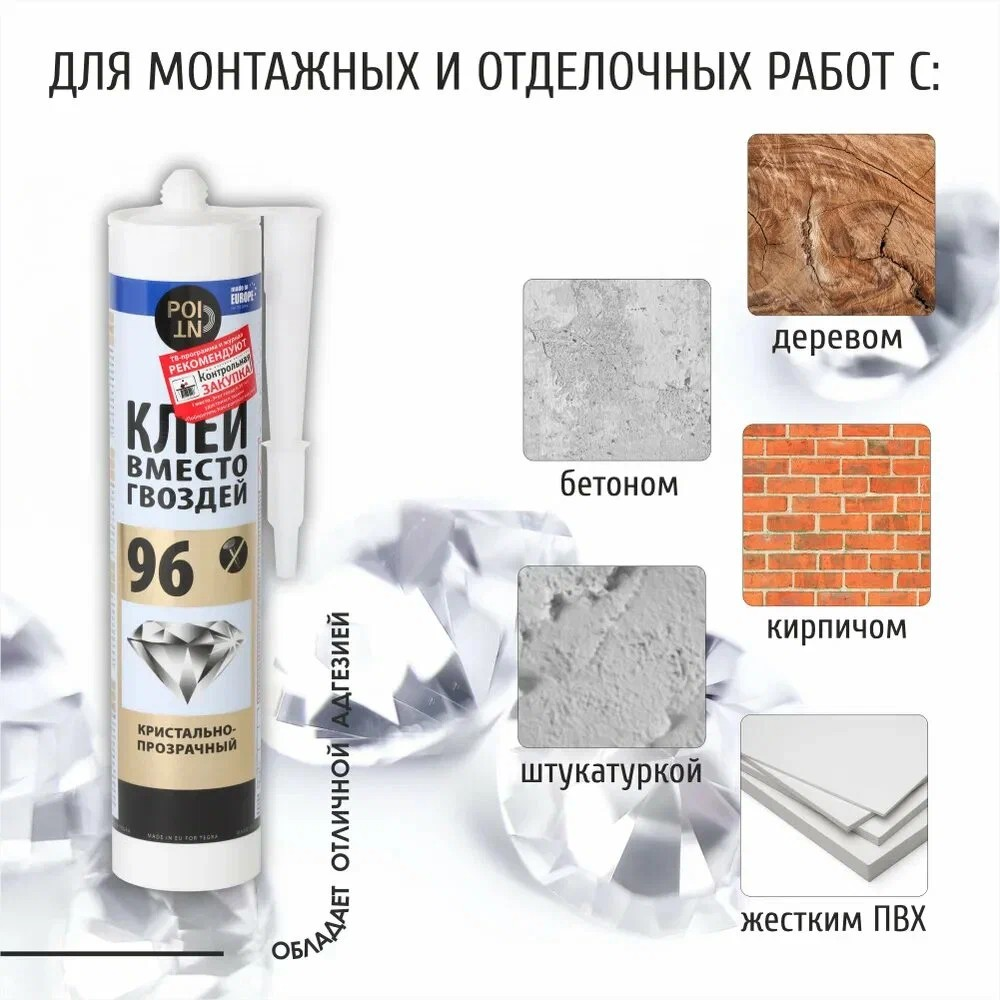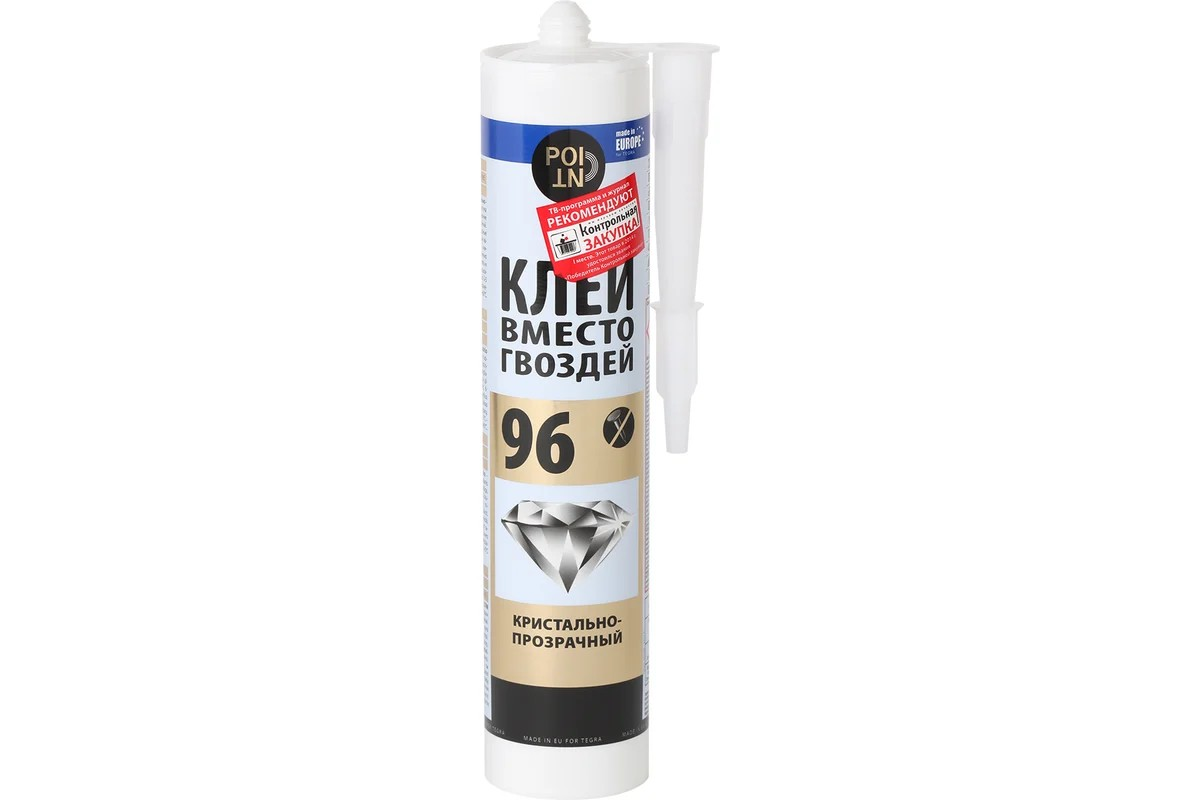 Клей вместо гвоздей 96 POINT (кристально прозрачный; 280 мл) используют во время монтажных и отделочных работ для приклеивания реек, панелей и досок из жесткого ПВХ и древесины, кессонов, розеток и карнизов из полиуретана.