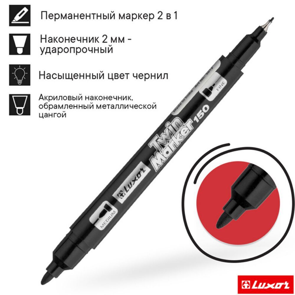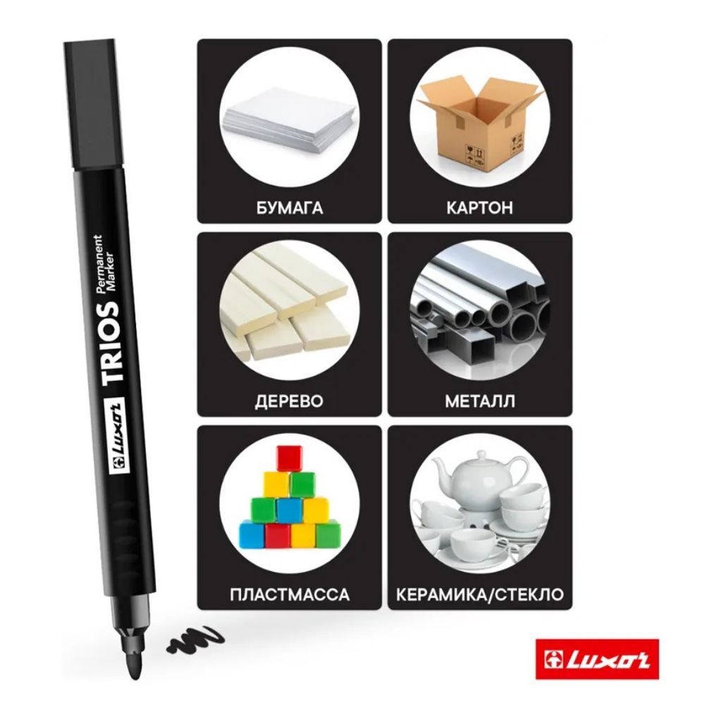 Эргономичный перманентный маркер Luxor "Trios" - универсальное решение для маркировки на всех типах поверхностей: металл, дерево, резина, бетон, камень, кирпич, стекло, пленка, картон. Трехгранный корпус перманентного маркера комфортно лежит в руке, рука не устает при длительном письме маркером. Корпус маркера изготовлен из прочного пластика. Плотный колпачок с клипом надежно предотвращает высыхание. Чернила на спиртовой основе. Чернила устойчивы к климатическим изменениям: дождь, туман, солнце, не стираются и не выцветают в течение длительного времени (до 3-х лет в зависимости от эксплуатации промаркированного изделия), оставляют четкую и однородную линию, безопасны для использования и не содержат ксилол и толуол. Длина непрерывной линии 700 метров. Цвет чернил - черный, диаметр пишущего узла от - 2,5 мм. Упаковка: картонная коробка по 12 штук.