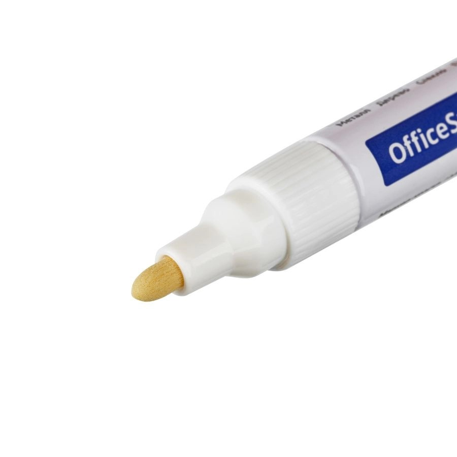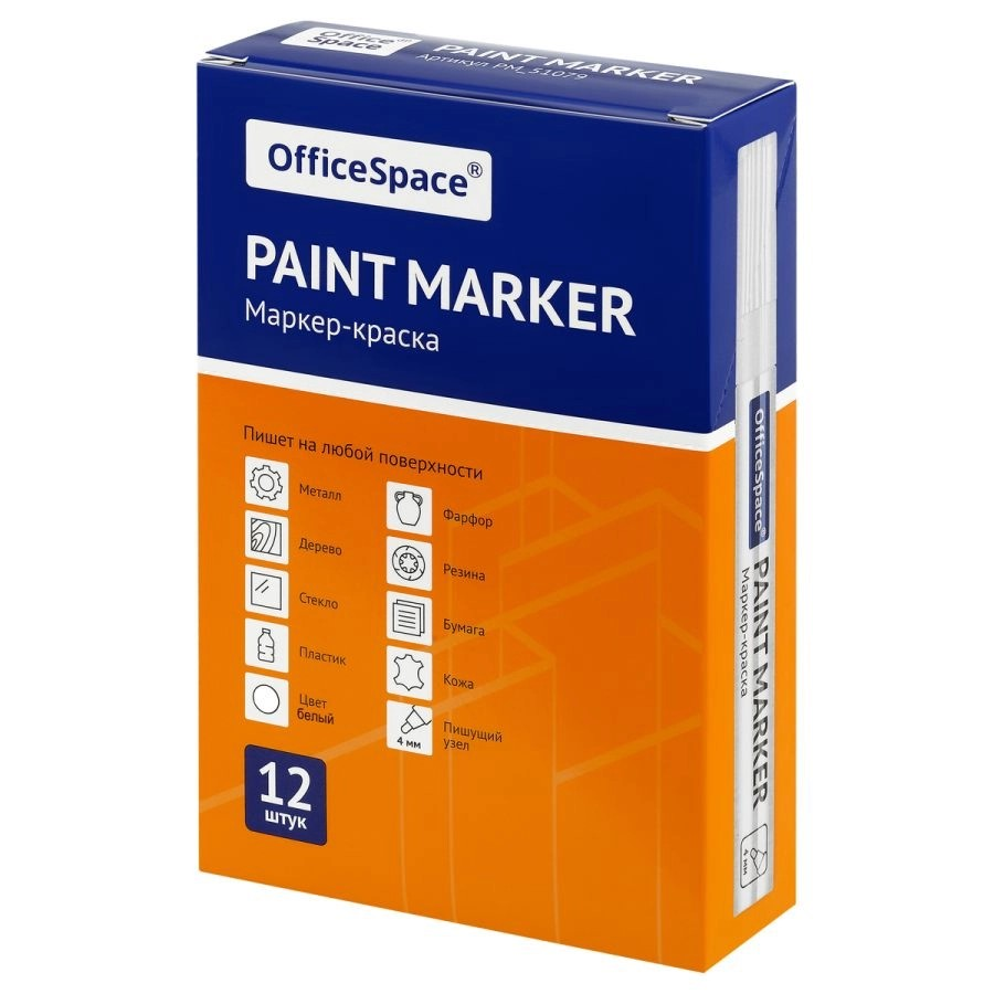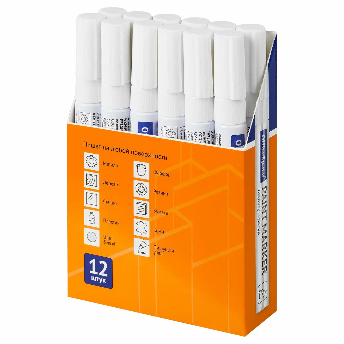 Маркер-краска OfficeSpace с чернилами на нитро-основе подходит для использования на металлических, деревянных, стеклянных и пластиковых поверхностях. Цвет – белый. Закругленный пишущий узел оставляет линии шириной 1-4 мм. Длина непрерывной линии – 600 метров. Металлический корпус. Маркеры упакованы по 12 штук в картонную коробку, которую можно использовать в качестве мини-витрины. • Тип: маркер-краска; • Основа: нитро; • Толщина линии: 1-4 мм; • Цвет: белый.