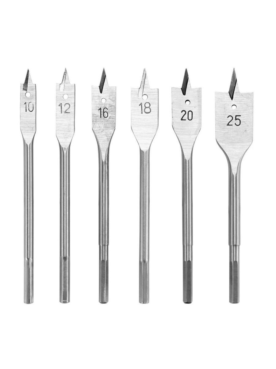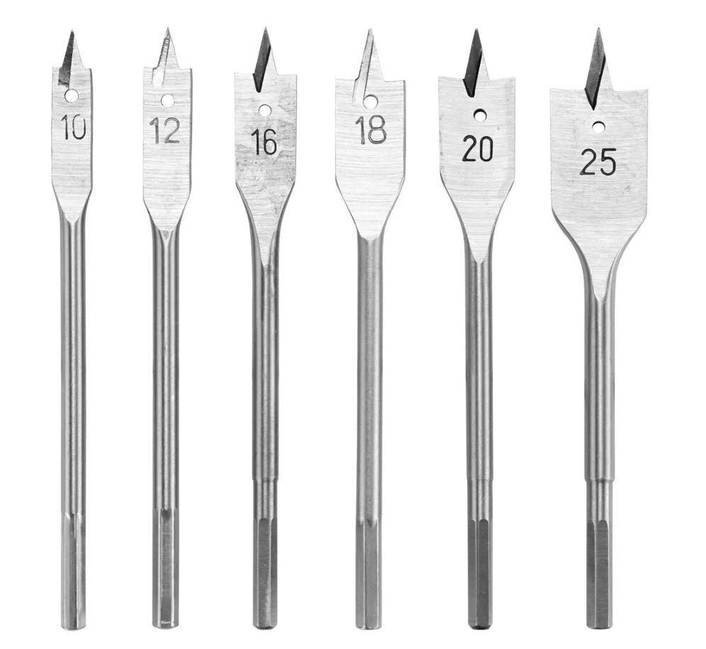 Набор перьевых (перовых) сверл по дереву 6 шт (10,12,16,18,25) с шестигранным хвостовиком. Сверла предназначены для просверливания отверстий в мягких и твердых породах дерева, фанере, ДСП. Могут использоваться с ручным и электрическим инструментом. Сверла изготовлены из высококачественной стали, что гарантирует высокую производительность и качественную обработку материала, а также длительный срок эксплуатации. Для получения наилучшего результата и продлить период эксплуатации, соблюдайте правила: Начинайте сверлить на малых оборотах дрели постепенно добавляя, но не более 300-450 об/мин. Такой подход позволяет добиться более качественных результатов и сохраняет сверло от деформации. Для труднодоступных мест используйте переходник, который закрепляется в патроне электродрели. Устанавливайте сверло выдержав угол в 90.