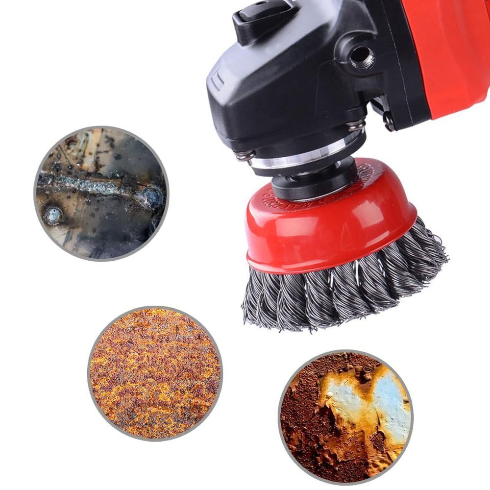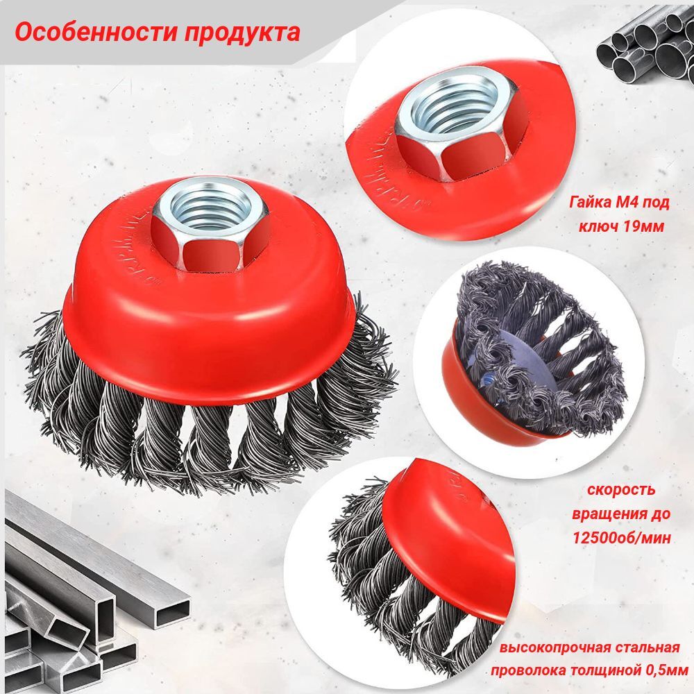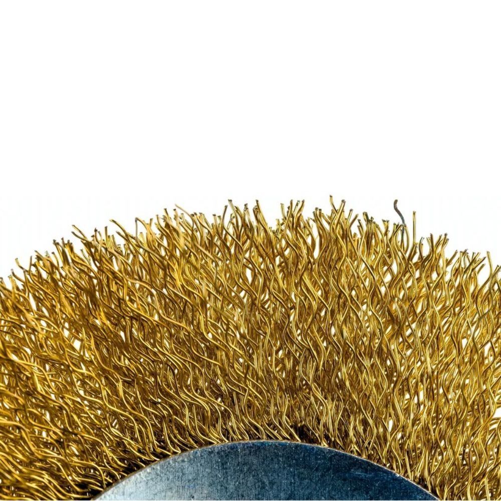В меру мягкая кордщетка чашка, используемая для финишной зачистки деревянных и варочных поверхностей, обработки сварочных швов, удаления следов ржавчины и старой краски. Щетина густая и ровная, за счет чего поверхность обрабатываемой детали выравнивается равномерно и аккуратно, также повышается прочность швов и снимается статическое напряжение. Латунное покрытие щетины дают плюс к износостойкости. Стальная проволока жестко фиксируется на стальной основе кордщетки. Чашеобразная форма подходит как для обработки коленчатых, так и для плоских поверхностей. Допустимая глубина обработки — от 0,05 до 0,1 мм. Блюдце-чашка со стальной крученной проволокой. Эти щетки имеют встроенный рабочий угол 45° для очистки поверхностей в труднодоступных местах, таких как внутренние углы, края и контуры.
