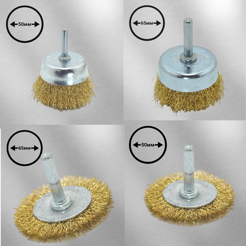 Набор щеток со шпильками для дрели из 5 насадок: 2 плоских 50-65мм и чашки 30- 50-65мм. Плоские легко проникают в труднодоступные места, углы и пазы, а чашка оптимально подходит для ровных поверхностей. Насадки используются на скорости до 4500 об/мин. Набор пригодится для удаления ржавчины, загрязнений, старых лакокрасочных покрытий. Преимущества: Долговечность — щетина выполнена из высококачественной стальной проволоки. Универсальность — набор подходит для любых твердых поверхностей: древесины, металла, пластика и т. д. Аккуратная работа — щетки с витой щетиной позволяют снять тонкий слой материала. Коррозионная стойкость — корпусы щеток оцинкованы, щетина покрыта латунью.