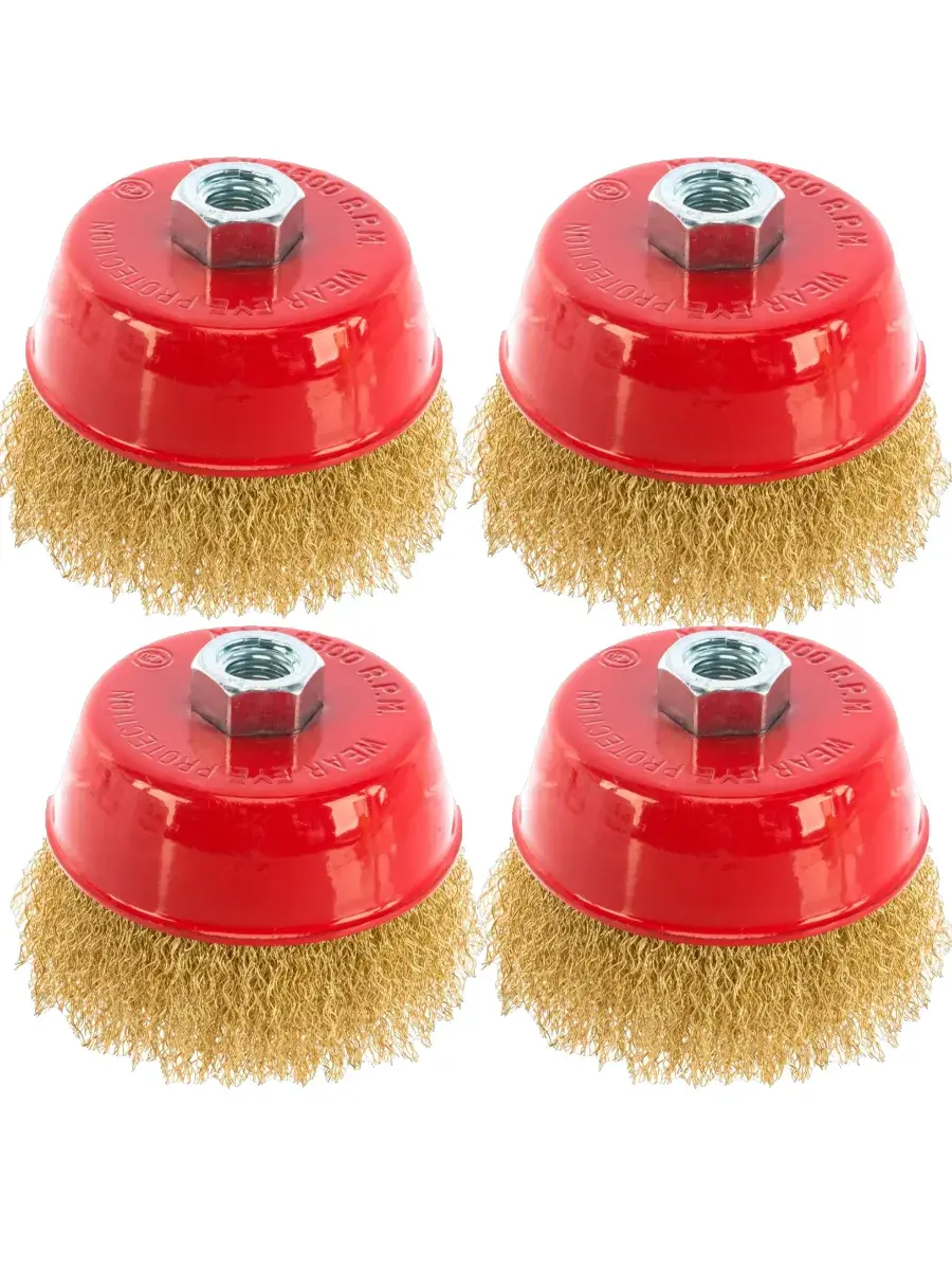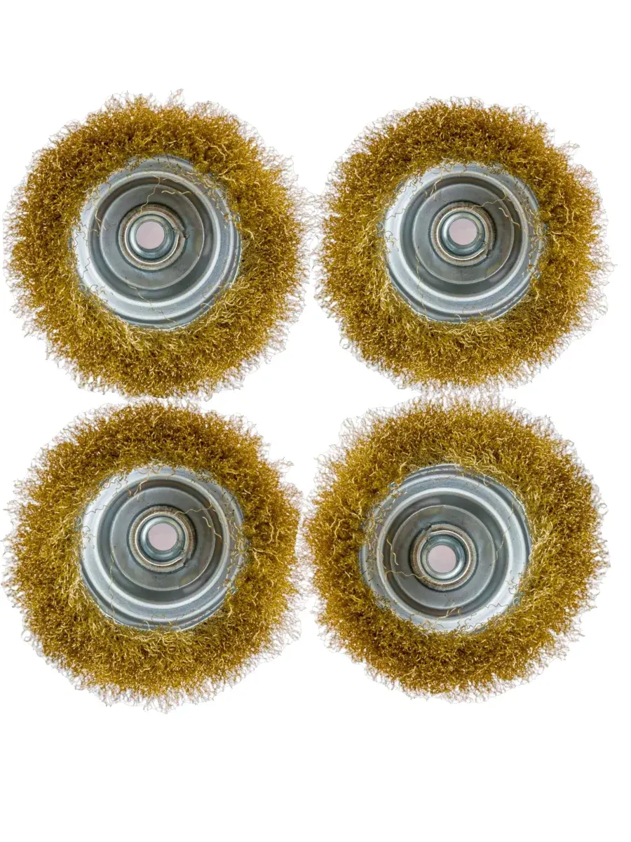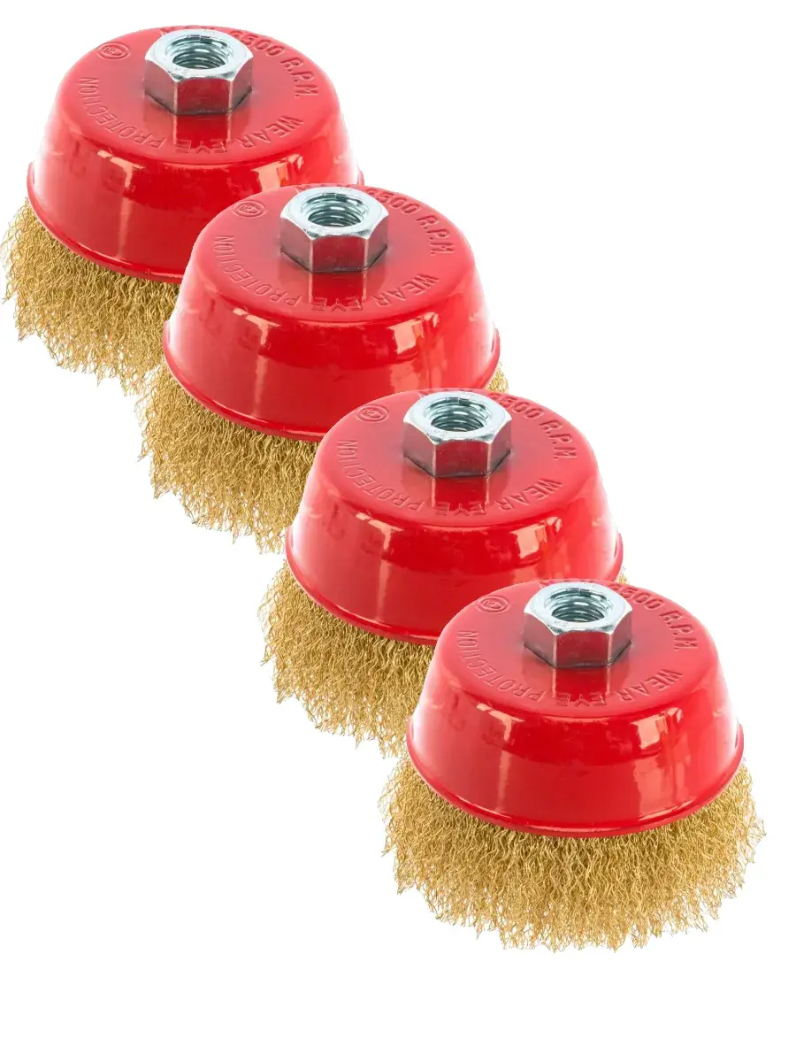 Набор из 4 мягких кордщеток, используемых для финишной зачистки деревянных и варочных поверхностей, обработки сварочных швов, удаления следов ржавчины и старой краски. Щетина густая и ровная, за счет чего поверхность обрабатываемой детали выравнивается равномерно и аккуратно, также повышается прочность швов и снимается статическое напряжение. Латунное покрытие щетины дают плюс к износостойкости. Стальная проволока жестко фиксируется на стальной основе кордщетки. Чашеобразная форма подходит как для обработки коленчатых, так и для плоских поверхностей. Допустимая глубина обработки — от 0,05 до 0,1 мм.