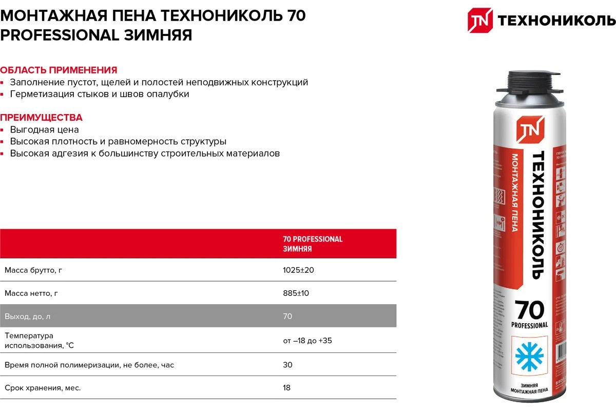 Монтажная профессиональная пена Технониколь 70 PROFESSIONAL зимняя представляет собой однокомпонентный полиуретановый материал в аэрозольной упаковке. Продукт отличается хорошим первичным расширением, повышенным объёмом выхода пены.